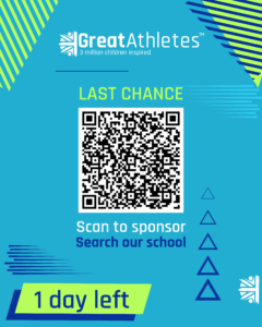 Today is the last day to raise money for the sponsored Great Athletes visit from [athlete name]! Please make sure any cash is brought into school by the end of the day along with your child’s sponsorship form, or donate via the online fundraising page.